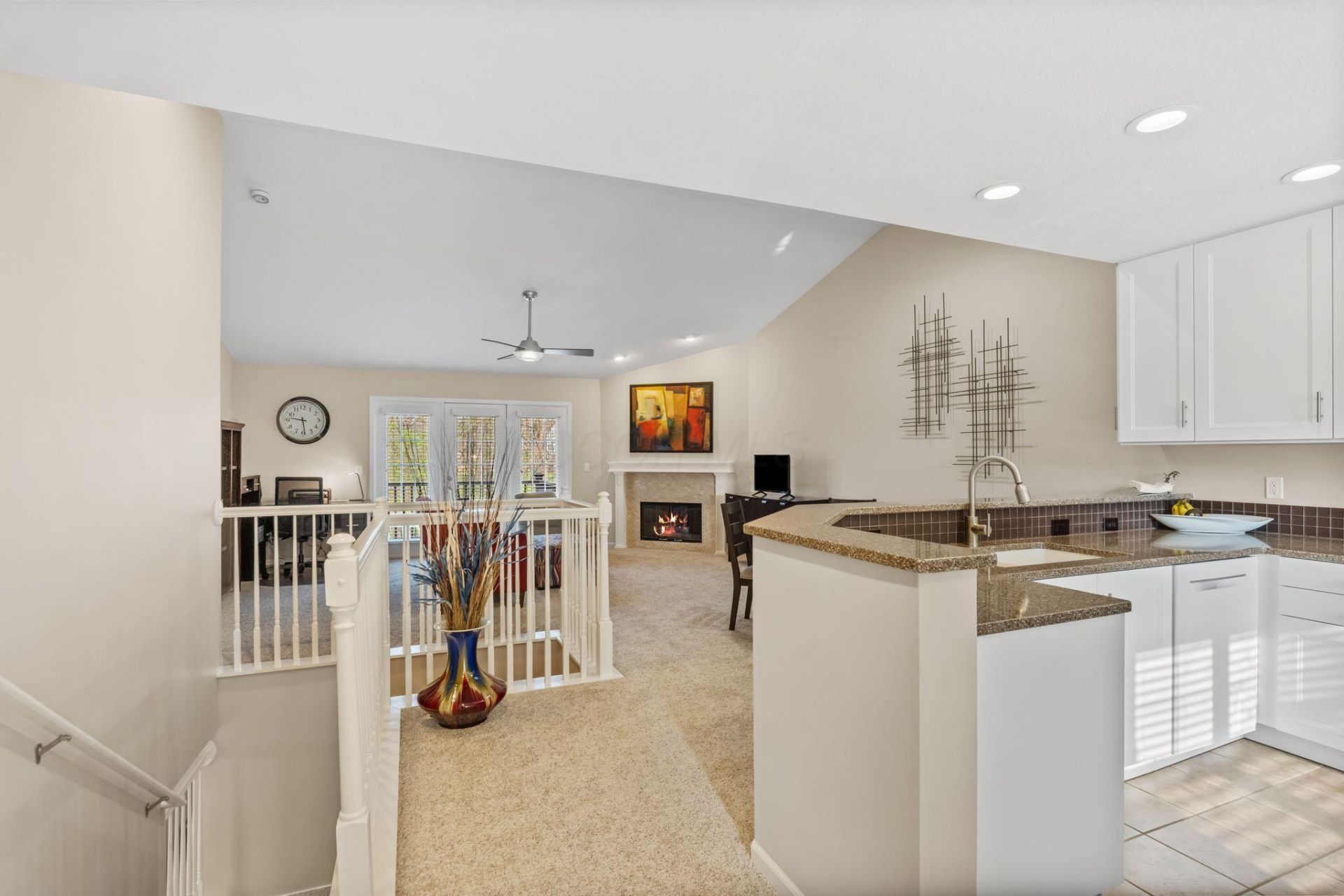 Welcome to this beautifullly upgraded, move-in ready 2-bed, 2.5-bath condo offering 2,227 sq. ft. of thoughtfully designed living space across two levels in the desirable Village at Slate Ridge community.This open-concept home features a bright & spacious upper-level Great Room w/ stunning cathedral ceiling, gas fireplace w/ custom mantle and tile. Direct access to a private composite deck w/ a Phantom screen--perfect for enjoying the City of Reynoldsburg Summer Concerts on the Lawn at Livingston House The lower-level Family Room provides additional living space with a gas fireplace & walk-out access to a concrete patio, w/ a Phantom screen.The kitchen is a true standout, showcasing LG and Bosch appliances (all included), quartz countertops, designer tile backsplash, soft-close cabinetry, & custom built-ins.Both oversized bedrooms offer large walk-in closets w/ custom organization systems. The primary suite features a luxurious en-suite bath w/ a double vanity, quartz countertops, and Jacuzzi soaker tub designed to retain warmth. A well-appointed guest bath and convenient half bath also feature quartz surfaces, upgraded fixtures and cabinets.Additional highlights include new carpet,durable laminate flooring,four new ceiling fans, new lighting fixtures, premium blinds, & USB outlets. Storage is abundant with multiple closets, slider shelf pull-outs, a large mechanical room, added attic insulation, and a concrete-floored crawl space.The laundry room is fully equipped with a Maytag washer and dryer, quartz countertops, custom cabinetry, and a built-in charging station. A spacious 2-car attached garage.Mechanically, the home offers peace of mind with a new Carrier HVAC system and A.O. Smith water heater, all-new fire and CO2 detectors & a clean radon test. The HOA includes water, trash, lawn care, snow removal, and exterior maintenance, & resident pool.Conveniently located near shopping, dining, & major highways. Comfort & convenience in one remarkable o